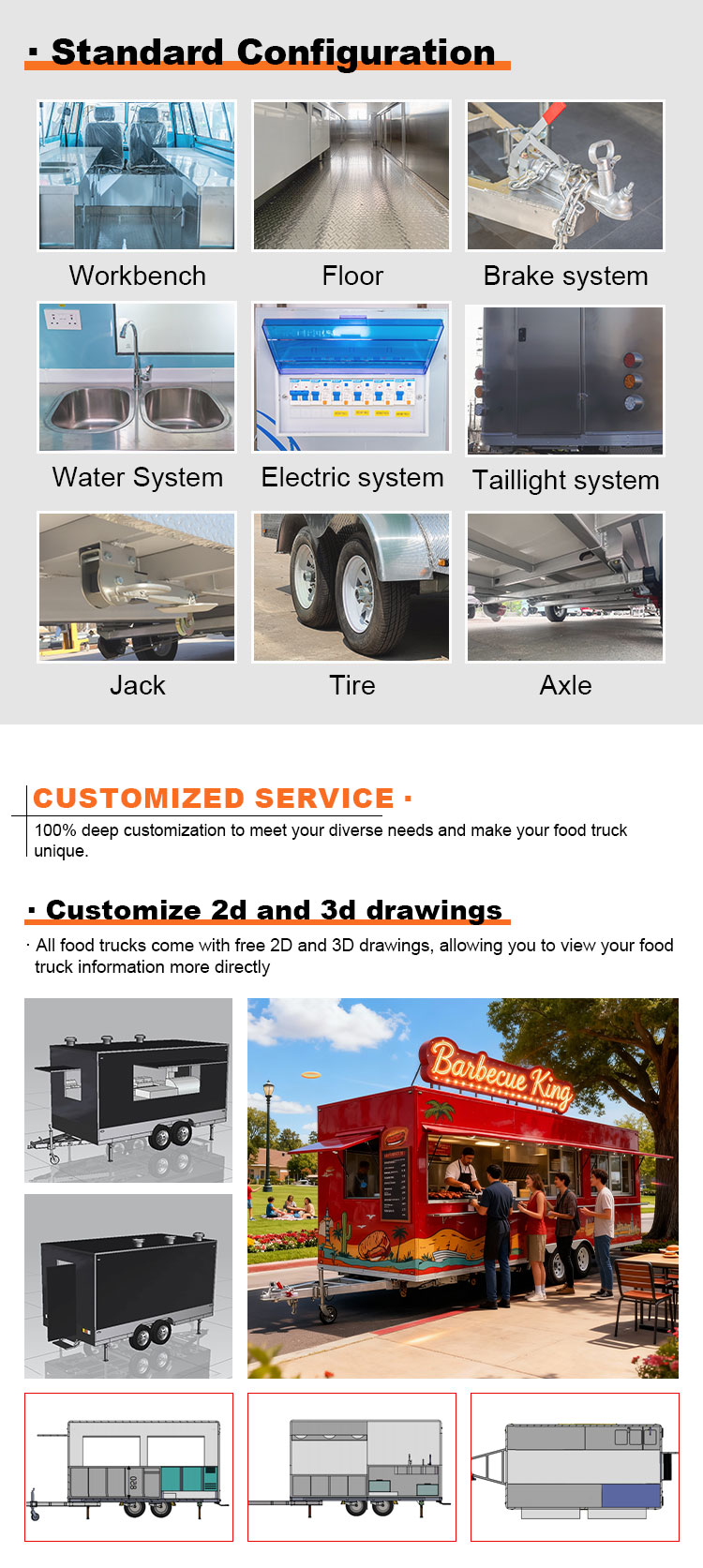 내식성과 내구성이 뛰어나고 다양한 환경 조건에서도 안정적인 성능을 유지할 수 있는 고품질 304 스테인리스 스틸을 주요 소재로 사용하여 당사의 푸드 케이터링 트레일러 제품이 장기적으로도 우수한 품질과 기능성을 유지하고 다양한 도전에 직면할 수 있도록 보장합니다. 304 스테인리스강은 부식에 대한 저항력이 뛰어나 트럭이 산화나 녹에 쉽게 영향을 받지 않아 수명이 크게 연장됩니다. 304 스테인리스강의 우수한 내식성은 트럭이 산화나 녹에 덜 민감하게 만들어 서비스 수명을 크게 연장시킵니다.