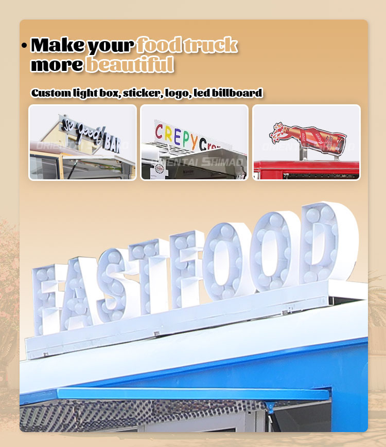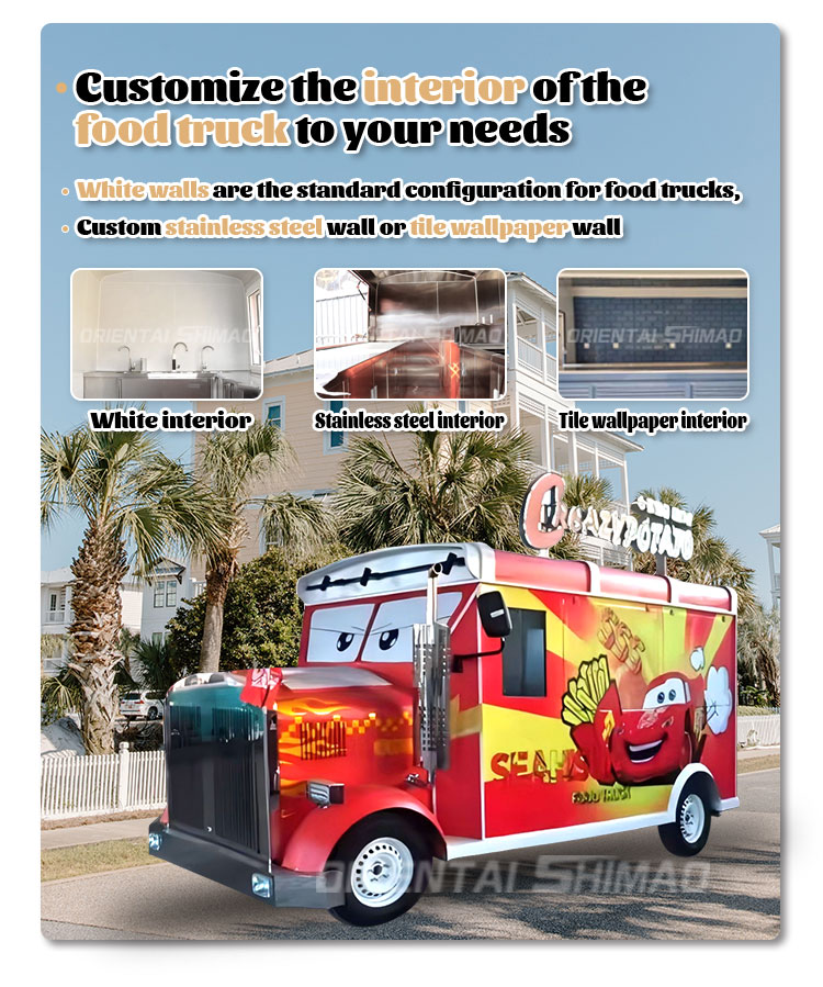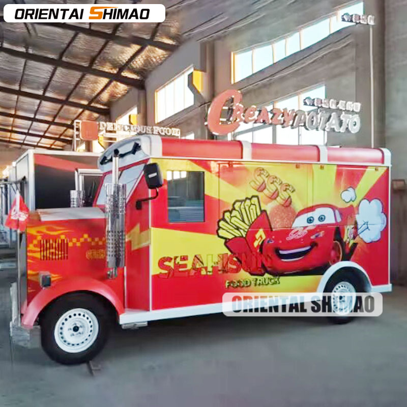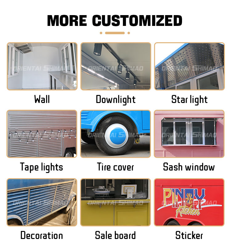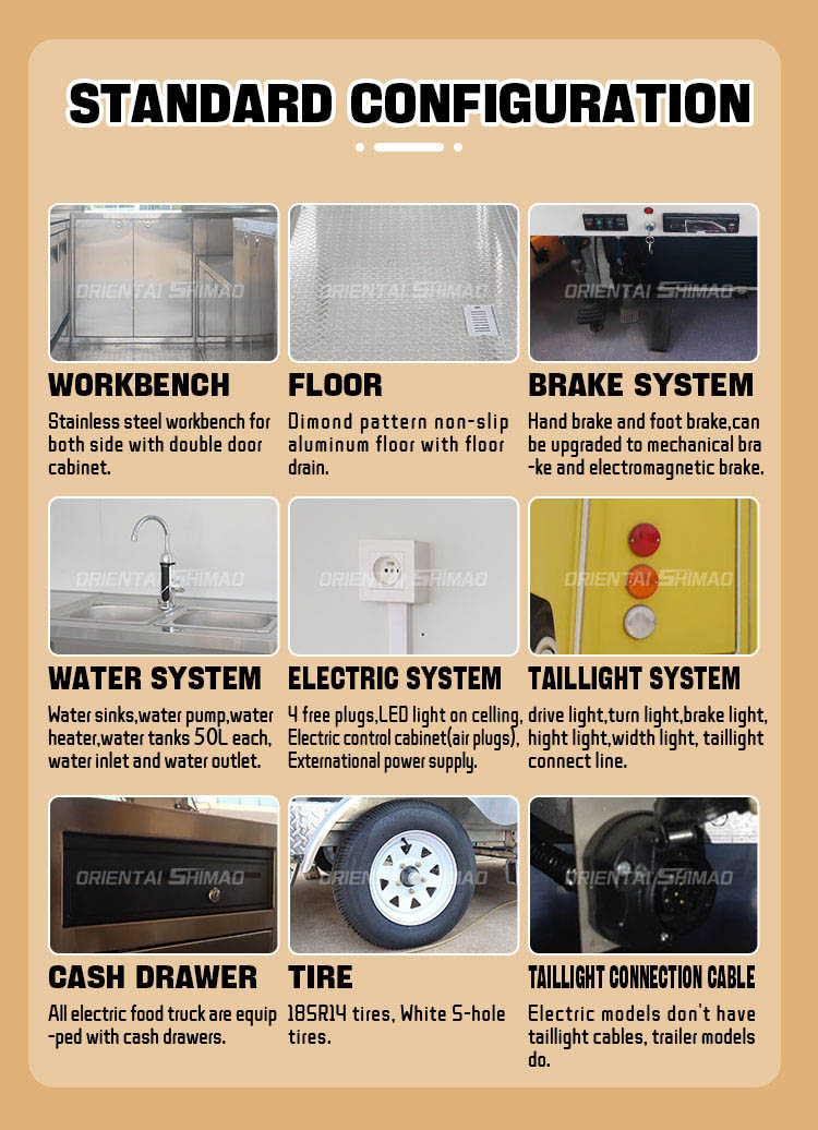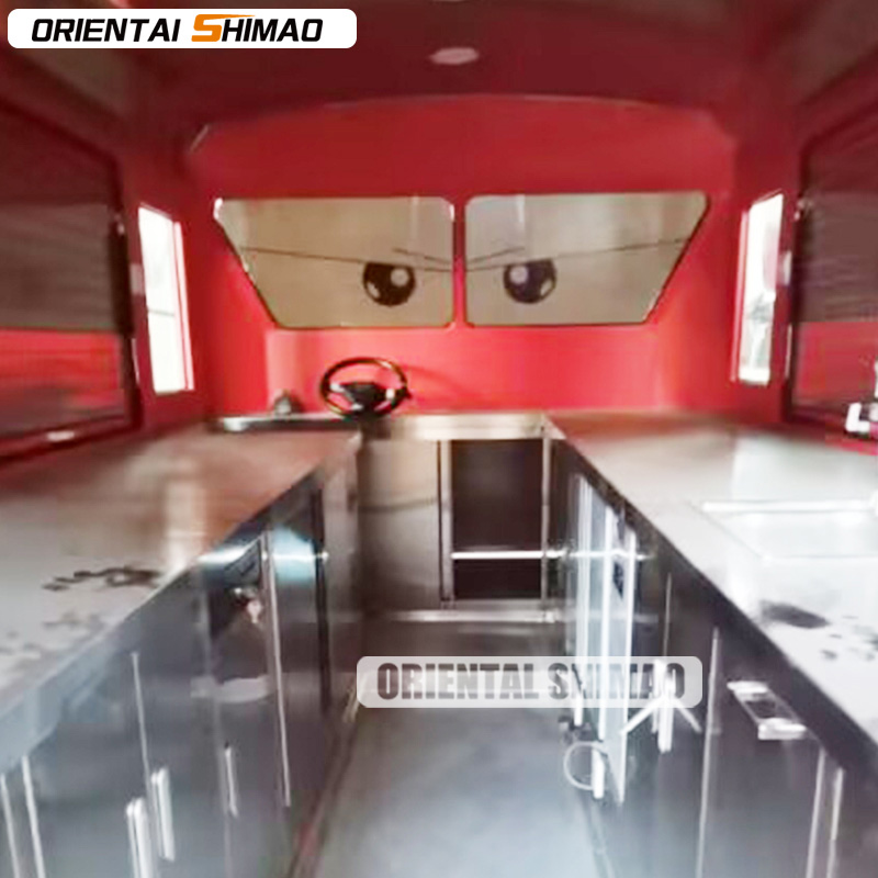 전기 푸드 트럭 : 냉장고, 레인지 후드, 표준 싱크대, 에어컨, 304 스테인리스 스틸 워크 벤치, 도넛 기계, 전기 컨베이어 토스터, 핫도그 그리드, 가스 그릴, 와플 베이커, 초콜릿 스토브, 프랑스 칩, 전기 주스 믹서.