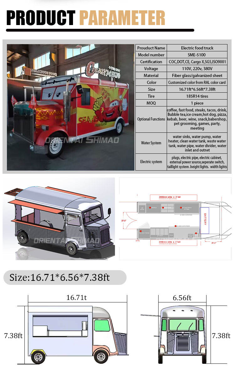 4.8m 핫 판매 전기 푸드 트럭의 매개 변수 사양은 다음과 같습니다.