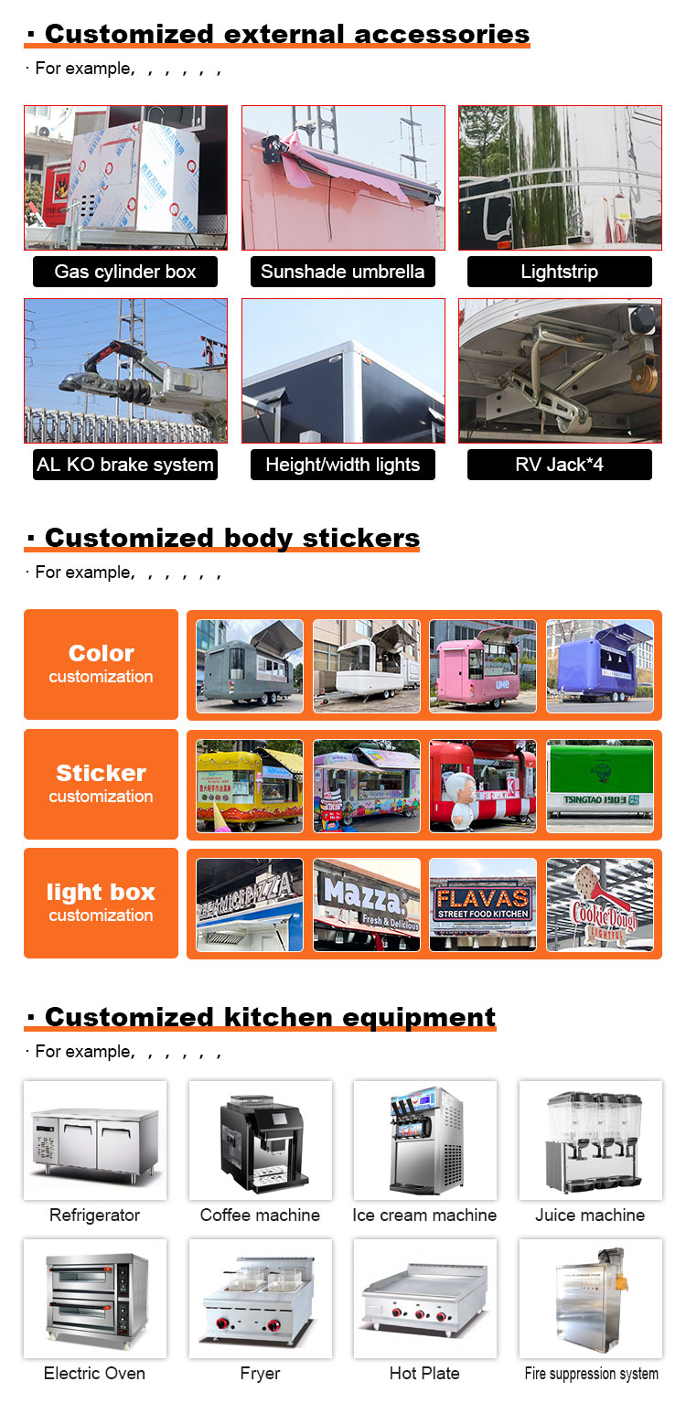 내식성과 내구성이 뛰어나고 다양한 환경 조건에서도 안정적인 성능을 유지할 수 있는 고품질 304 스테인리스 스틸을 주요 소재로 사용하여 당사의 푸드 케이터링 트레일러 제품이 장기적으로도 우수한 품질과 기능성을 유지하고 다양한 도전에 직면할 수 있도록 보장합니다. 304 스테인리스강은 부식에 대한 저항력이 뛰어나 트럭이 산화나 녹에 쉽게 영향을 받지 않아 수명이 크게 연장됩니다. 304 스테인리스강의 우수한 내식성은 트럭이 산화나 녹에 덜 민감하게 만들어 서비스 수명을 크게 연장시킵니다.