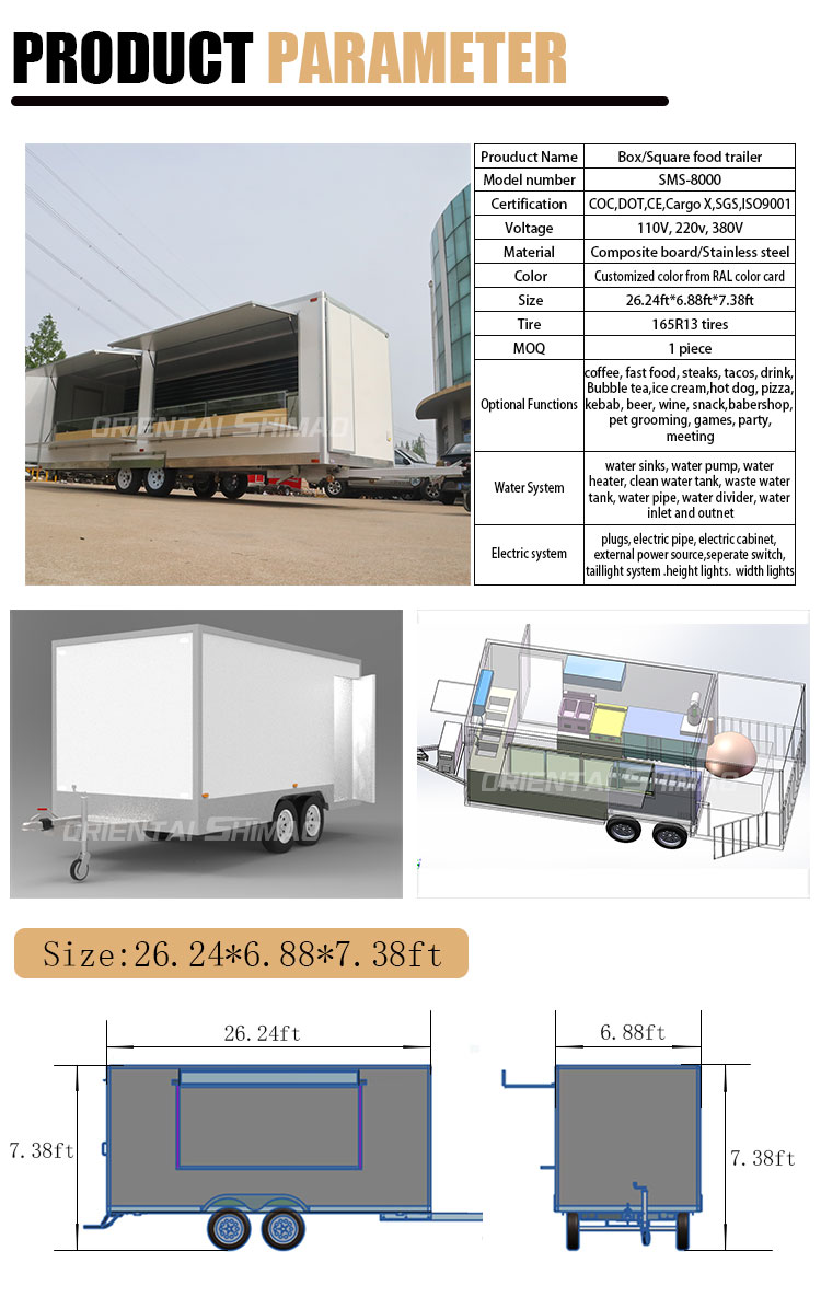 Oriental Shimao Food Trailer Stainless Steel은 확실히 업계에서 새로운 벤치 마크를 설정했습니다. 우리의 식품 카트는 부하 용량과 구동 안정성을 염두에두고 설계되었으며, 이중 베어링 시스템이 특별히 장착되어있어 식품 카트가 최대 2 톤의 부하를 운반 할 수 있으며, 전체 재료와 장비를 통해 부드럽고 안전한 승차감을 보장하여 운영자에게 훌륭한 편의와 신뢰를 제공합니다.