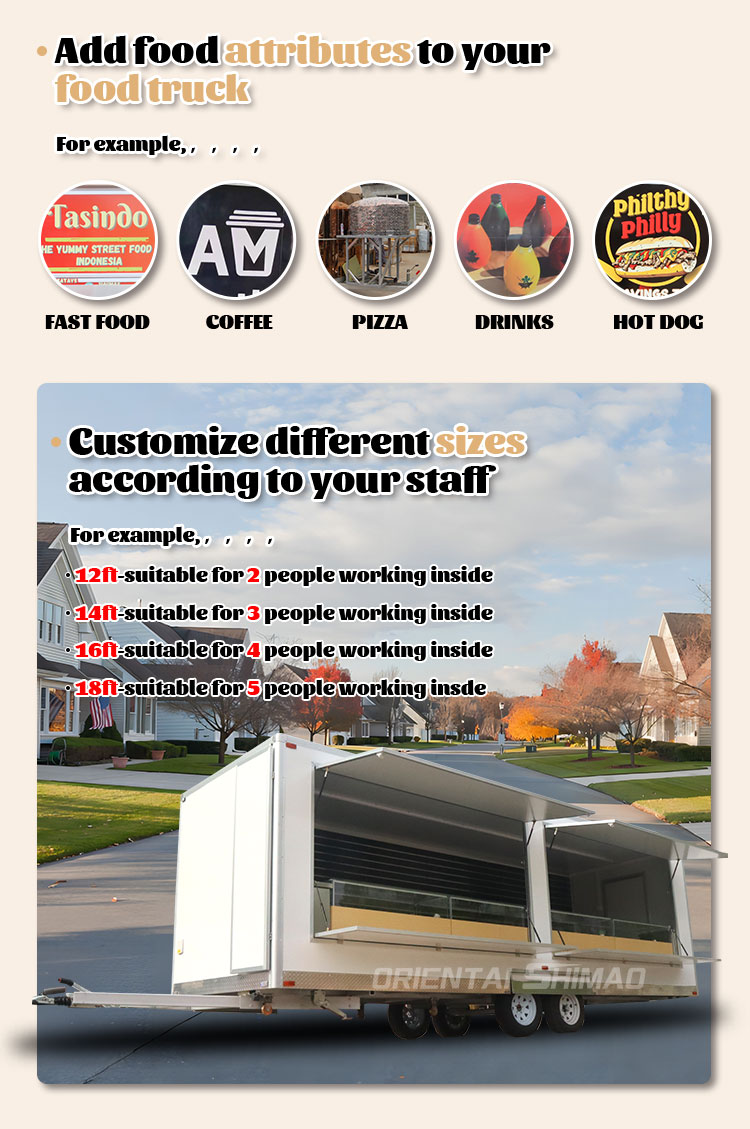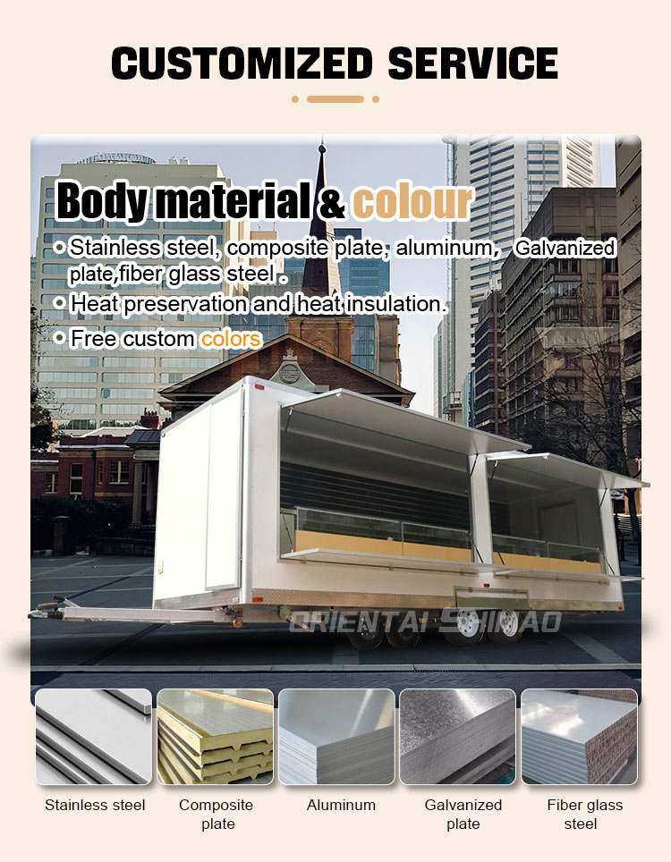 Oriental Shimao Food Trailer Stainless Steel에서는 각 고객의 고유 한 요구와 개인화 된 추구를 이해하므로 모든 음식 카트가 비즈니스 철학 및 브랜드 이미지에 완벽하게 맞도록 모든 심층적 인 사용자 정의 서비스를 제공하기 위해 노력하고 있습니다. 다음은 주요 제품 사용자 정의 서비스의 자세한 확장입니다.