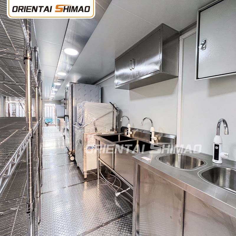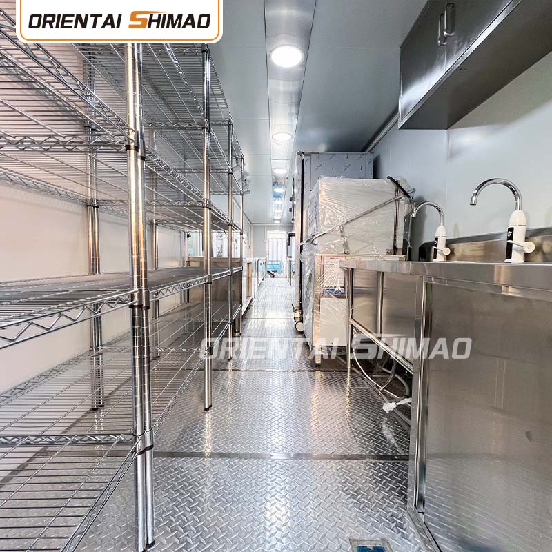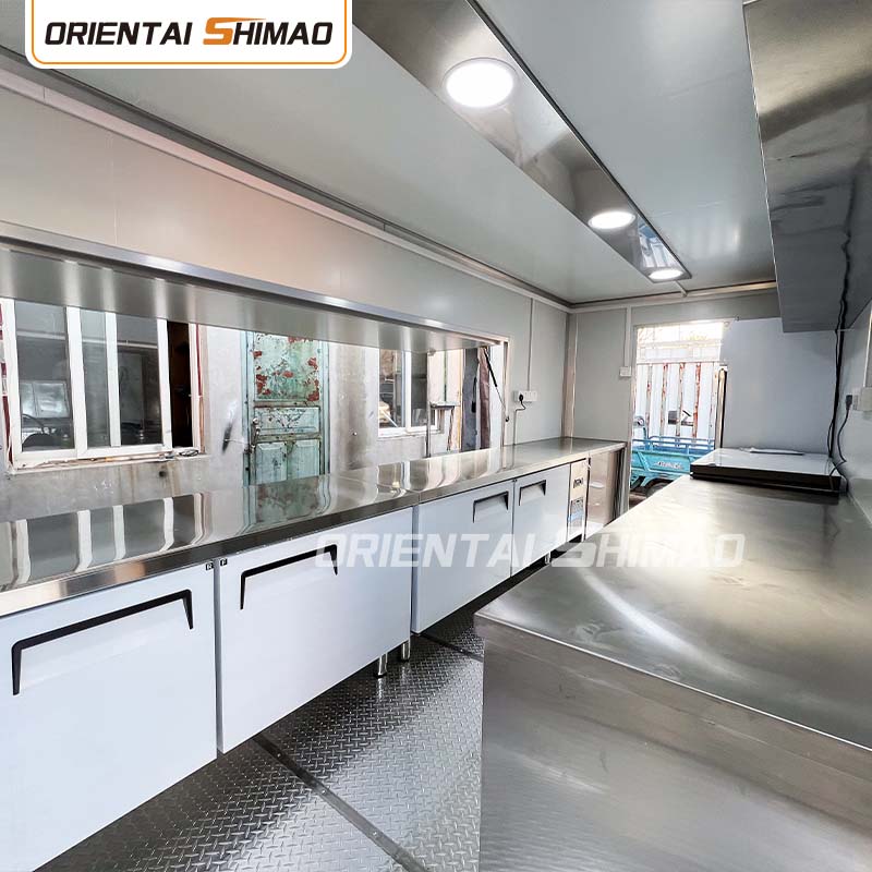 내부 레이아웃: 주방, 식당, 수납 공간 및 기타 공간을 합리적으로 계획하여 공간 활용을 극대화합니다. 동시에 비즈니스 요구에 따라 생산 영역, 난방 영역, 판매 영역 등 다양한 기능 영역을 설정하여 운영을 촉진하고 운영 효율성을 향상시킵니다.