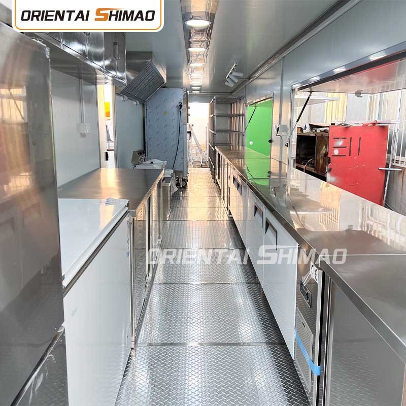 스테인레스 스틸 내부: 내부가 스테인레스 스틸로 제작되어 견고하고 내구성이 뛰어난 내부를 보장하며 청소 및 유지 관리가 쉽고 식품 위생 기준을 충족합니다. 스테인레스 스틸을 사용하면 푸드트럭의 수명이 향상될 뿐만 아니라 음식 준비 과정의 위생과 안전성도 보장됩니다.