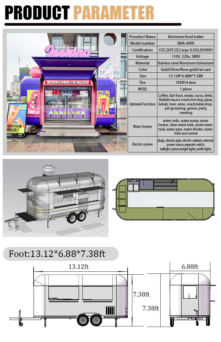 골든 스테인레스 스틸: 푸드트럭의 외관은 고품질 골든 스테인레스 스틸로 제작되었습니다. 이 소재는 내식성, 내마모성이 우수할 뿐만 아니라 금빛 외관이 시각적 아름다움과 고급감을 높여 다양한 환경에서 푸드트럭이 돋보일 수 있도록 해줍니다.