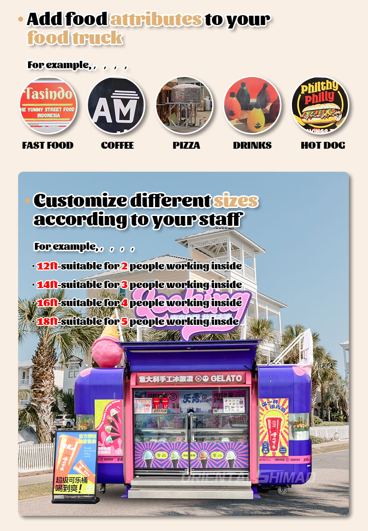모델링 및 스타일: 푸드트럭의 외관 모델링 및 스타일은 고객을 유치하는 중요한 요소입니다. 유선형 디자인, 복고풍 스타일, 현대적인 단순성 등 고객의 브랜드 이미지, 비즈니스 특성 또는 개인 취향에 따라 맞춤 설정할 수 있습니다.