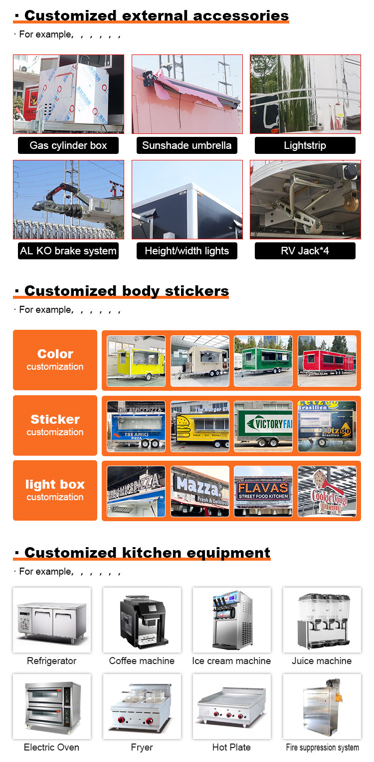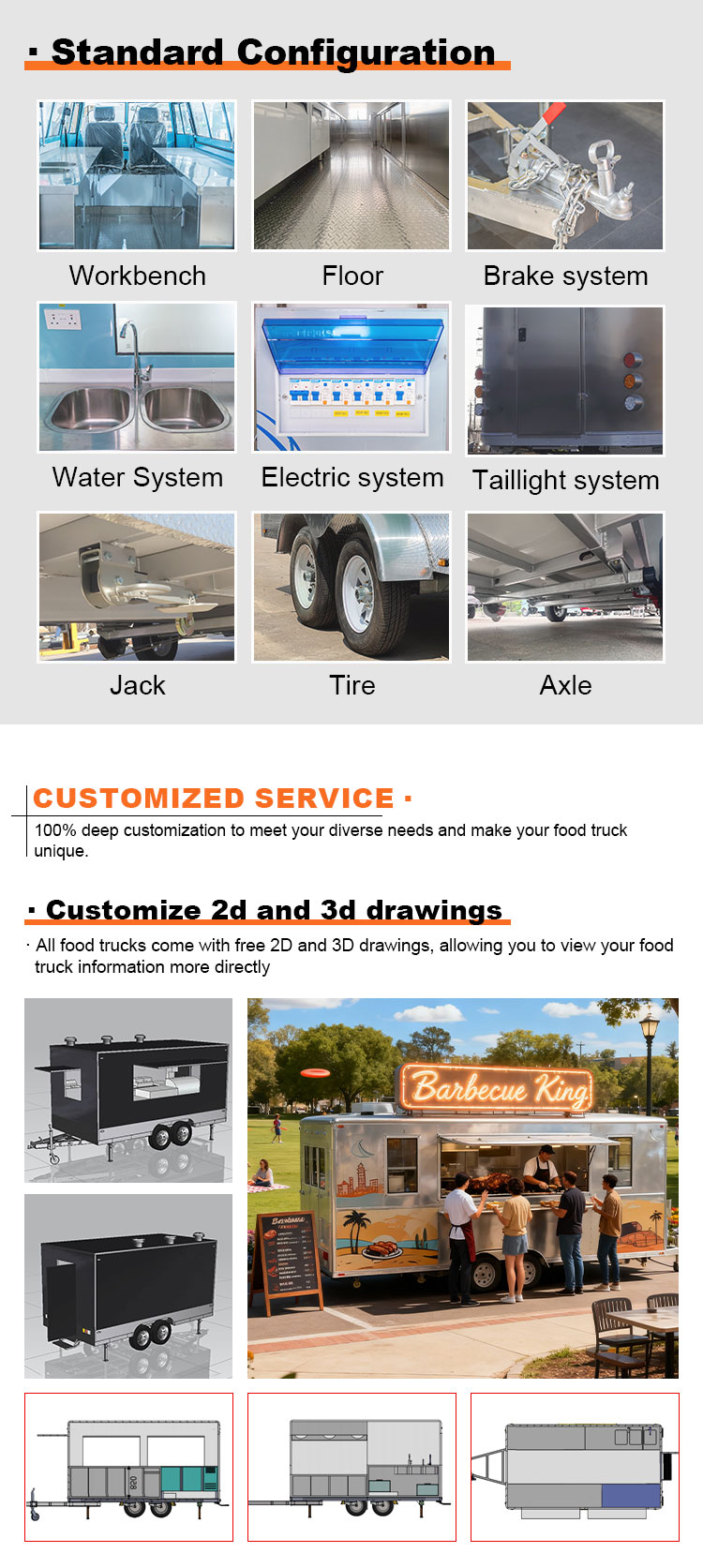 주요 소재로는 내식성과 내구성이 우수하고 다양한 환경 조건에서도 안정적인 성능을 유지할 수 있는 고품질 304 스테인레스 스틸을 선택하여 당사의 모바일 푸드트럭 트레일러 제품이 장기적으로도 우수한 품질과 기능성을 유지하며 다양한 도전에 직면할 수 있도록 보장합니다. 304 스테인리스강은 부식에 대한 저항력이 뛰어나 트럭이 산화나 녹에 쉽게 영향을 받지 않아 수명이 크게 연장됩니다. 304 스테인리스강의 우수한 내식성은 트럭이 산화나 녹에 덜 민감하게 만들어 서비스 수명을 크게 연장시킵니다.