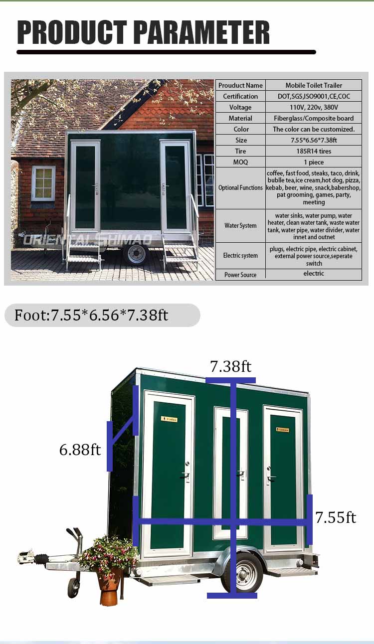 · 사용자 친화적 인 디자인 : 차량의 내부 공간은 별도의 손 씻기 스테이션, 전신 거울, 자동 센서 탭 및 화장지 디스펜서를 통해 움직임을위한 충분한 공간을 제공하도록 신중하게 설계되었습니다. 환기 시스템과 냄새 제어 시스템은 공기를 신선하게 유지하여 사용자에게 편안한 경험을 제공 할 수 있습니다.