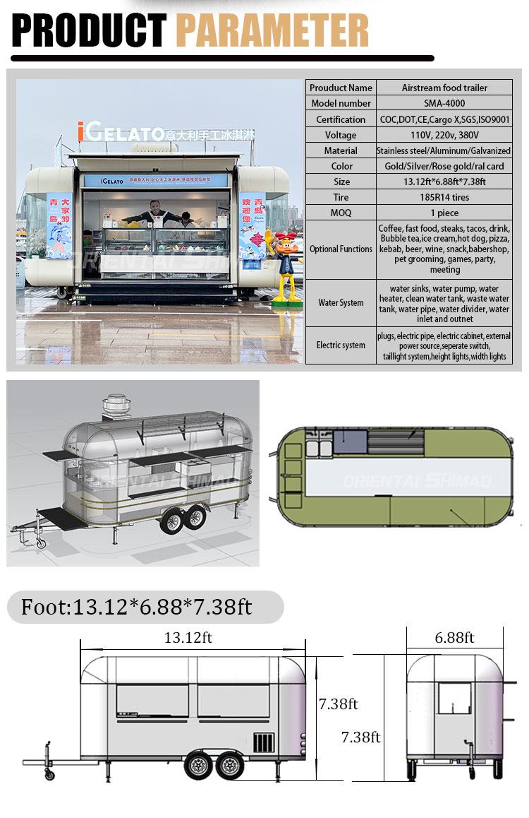 골든 스테인레스 스틸: 푸드트럭의 외관은 고품질 골든 스테인레스 스틸로 제작되었습니다. 이 소재는 내식성, 내마모성이 우수할 뿐만 아니라 금빛 외관이 시각적 아름다움과 고급감을 높여 다양한 환경에서 푸드트럭이 돋보일 수 있도록 해줍니다.