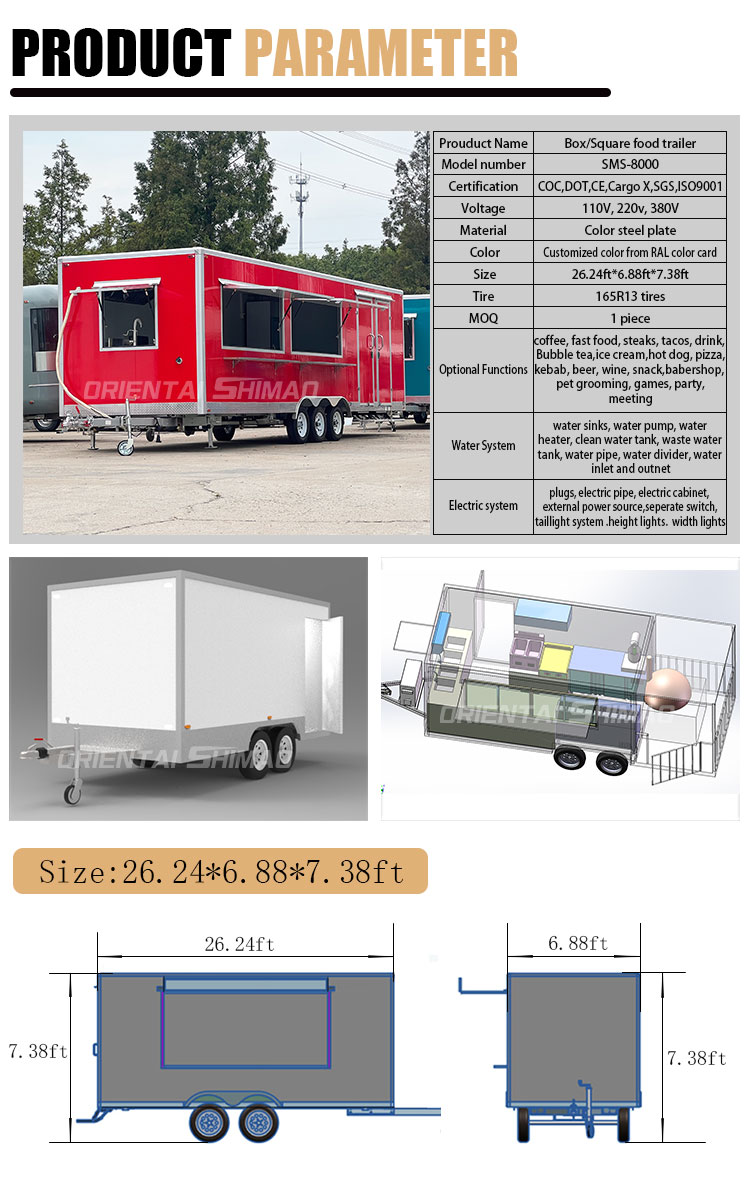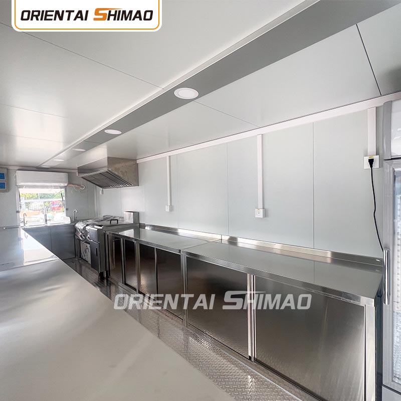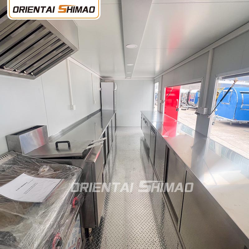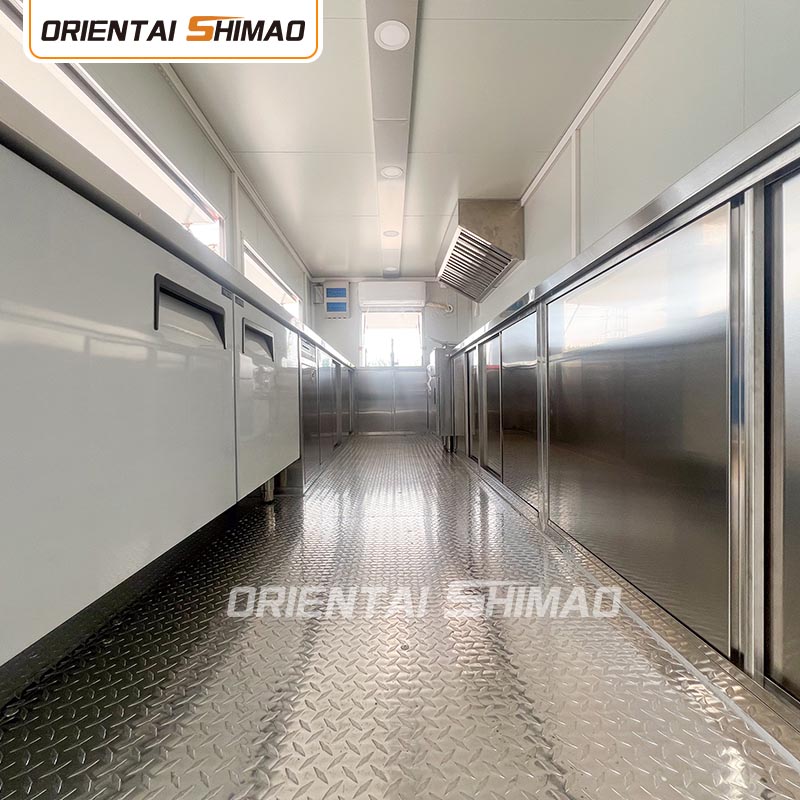 스테인레스 스틸 내부: 내부가 스테인레스 스틸로 제작되어 견고하고 내구성이 뛰어난 내부를 보장하며 청소 및 유지 관리가 쉽고 식품 위생 기준을 충족합니다. 스테인레스 스틸을 사용하면 푸드트럭의 수명이 향상될 뿐만 아니라 음식 준비 과정의 위생과 안전성도 보장됩니다.
