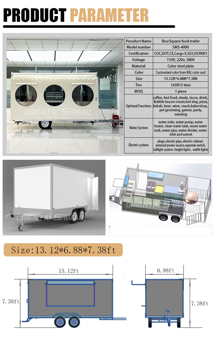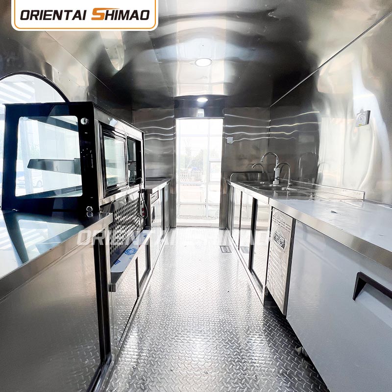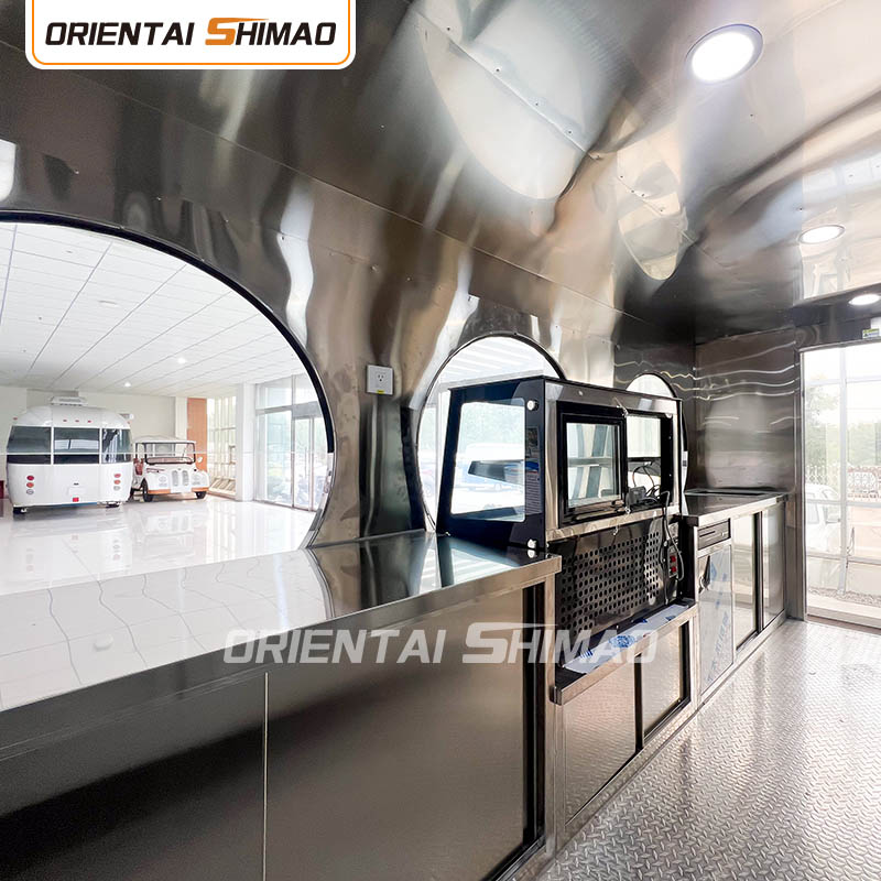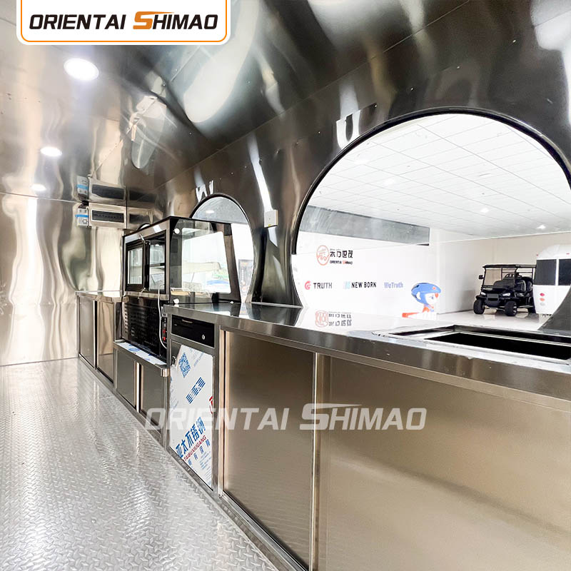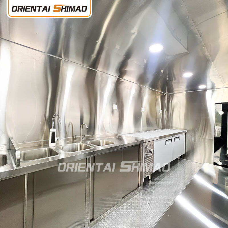 스테인레스 스틸 내부: 내부가 스테인레스 스틸로 제작되어 견고하고 내구성이 뛰어난 내부를 보장하며 청소 및 유지 관리가 쉽고 식품 위생 기준을 충족합니다. 스테인레스 스틸을 사용하면 푸드트럭의 수명이 향상될 뿐만 아니라 음식 준비 과정의 위생과 안전성도 보장됩니다.