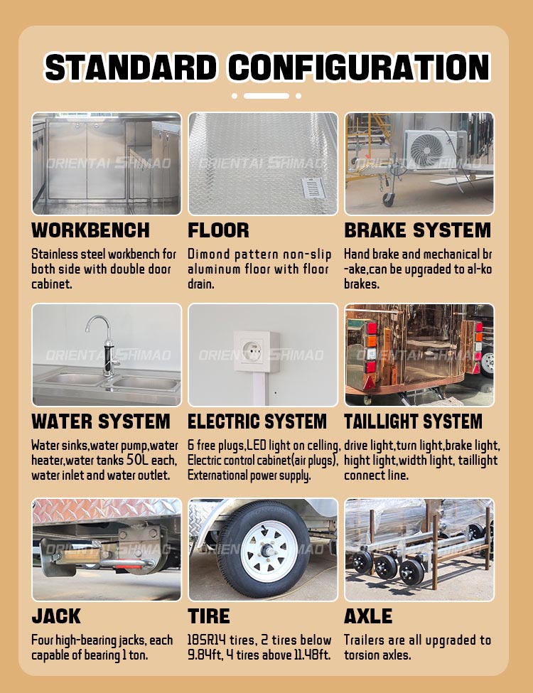 내식성과 내구성이 뛰어나고 다양한 환경 조건에서도 안정적인 성능을 유지할 수 있는 고품질 304 스테인레스 스틸을 주재료로 사용하여 타코 컨세션 푸드트럭 제품이 장기적으로도 우수한 품질과 기능성을 유지하며 다양한 난제에 직면할 수 있도록 보장합니다. 304 스테인리스강은 부식에 대한 저항력이 뛰어나 트럭이 산화나 녹에 쉽게 영향을 받지 않아 수명이 크게 연장됩니다. 304 스테인리스강의 우수한 내식성은 트럭이 산화나 녹에 덜 민감하게 만들어 서비스 수명을 크게 연장시킵니다.