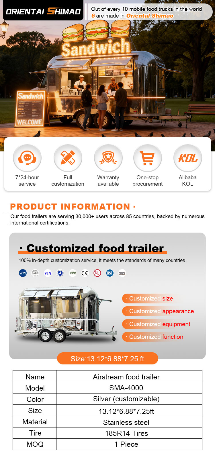 우리는 트레일러 푸드 트럭 인증을 제공할 수 있습니다: DOT, CE, SGS, SCI, ISO, COC,
