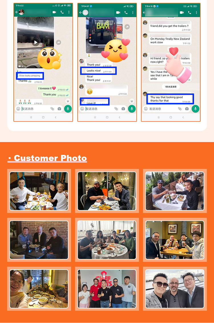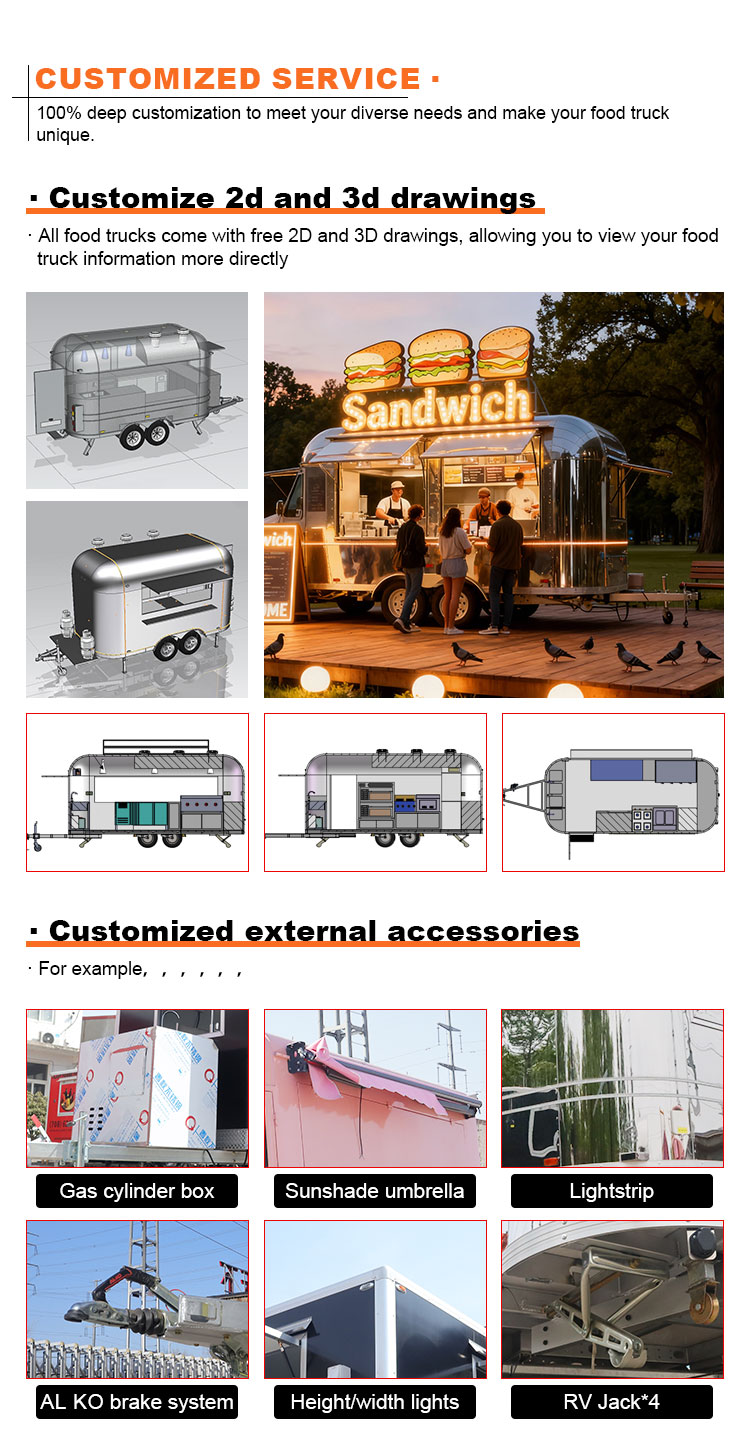 내식성과 내구성이 우수하고 다양한 환경 조건에서도 안정적인 성능을 유지할 수 있는 고품질 304 스테인리스 스틸을 주재료로 사용하여, 당사의 트레일러 푸드트럭 제품이 장기적으로도 우수한 품질과 기능성을 유지하며 다양한 도전에 직면할 수 있도록 보장합니다. 304 스테인리스강은 부식에 대한 저항력이 뛰어나 트럭이 산화나 녹에 쉽게 영향을 받지 않아 수명이 크게 연장됩니다. 304 스테인리스강의 우수한 내식성은 트럭이 산화나 녹에 덜 취약하게 만들어 서비스 수명을 크게 연장시킵니다.