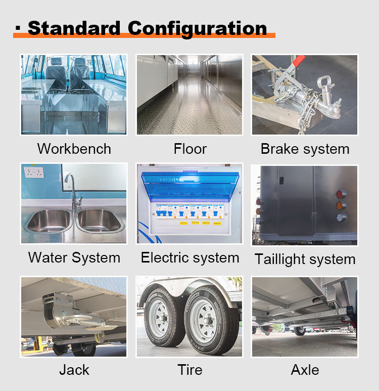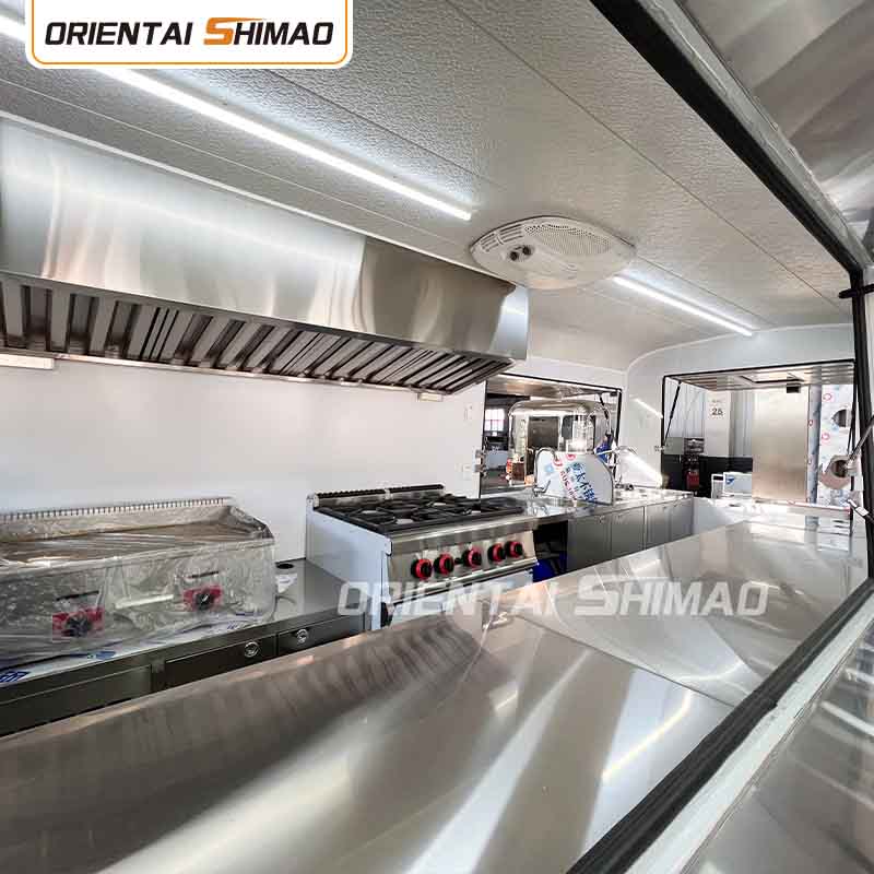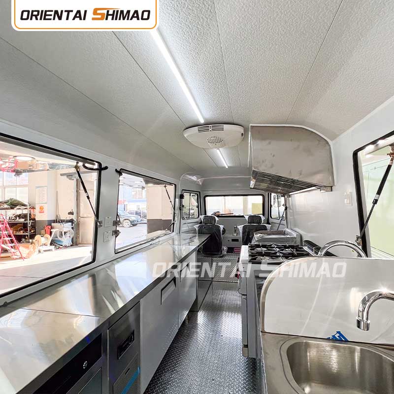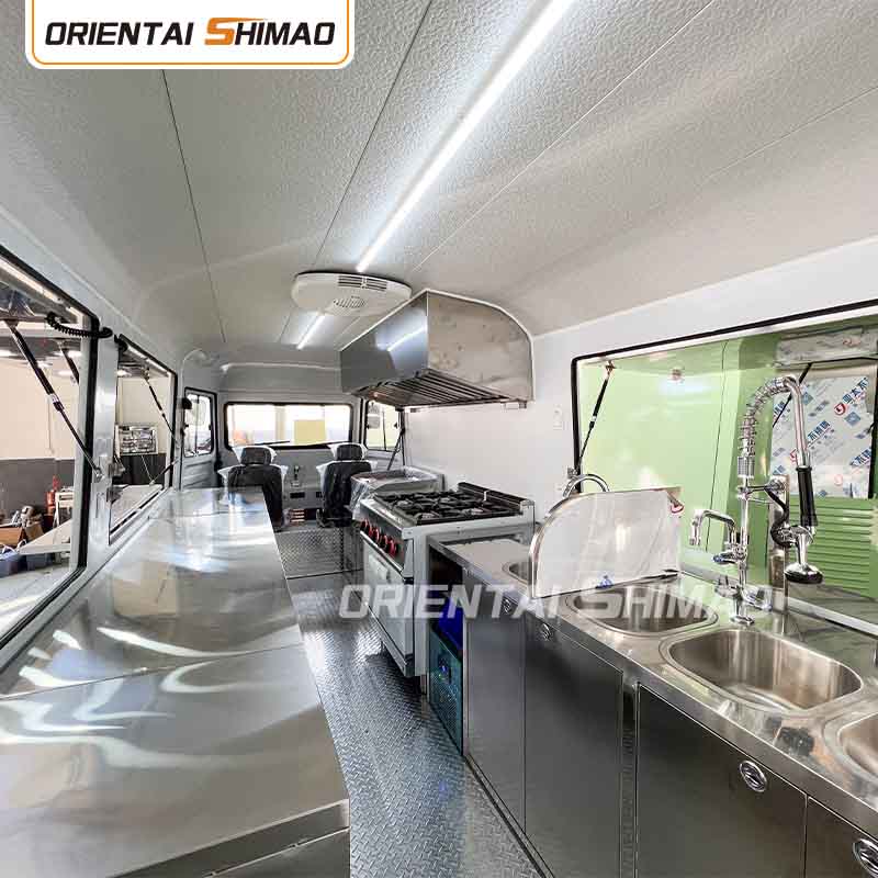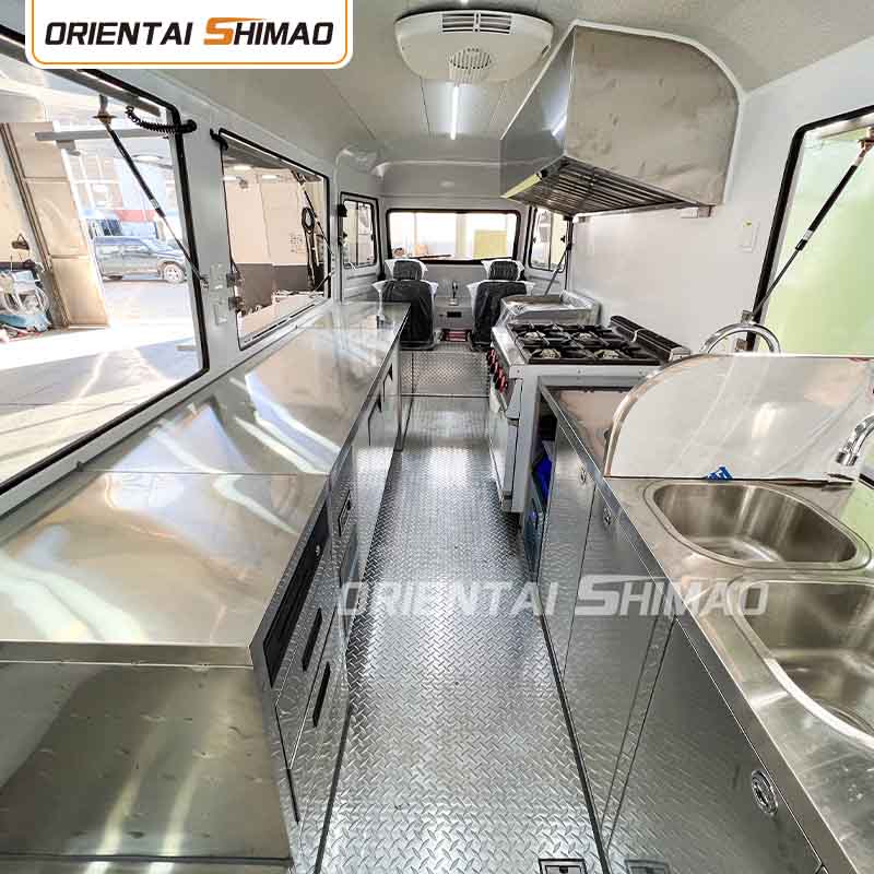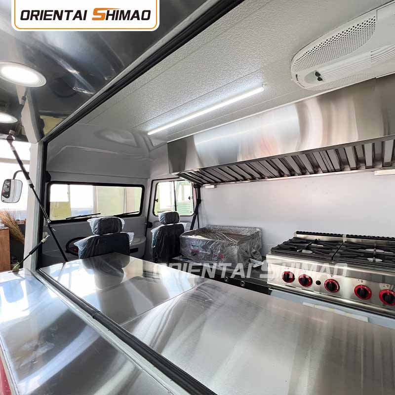 스테인레스 스틸 내부: 내부가 스테인레스 스틸로 제작되어 견고하고 내구성이 뛰어난 내부를 보장하며 청소 및 유지 관리가 쉽고 식품 위생 기준을 충족합니다. 스테인레스 스틸을 사용하면 푸드트럭의 수명이 향상될 뿐만 아니라 음식 준비 과정의 위생과 안전성도 보장됩니다.