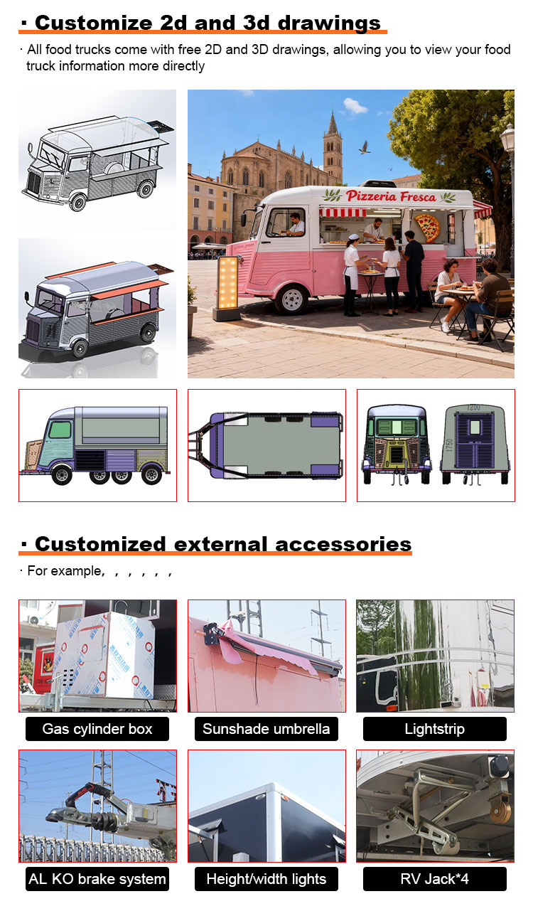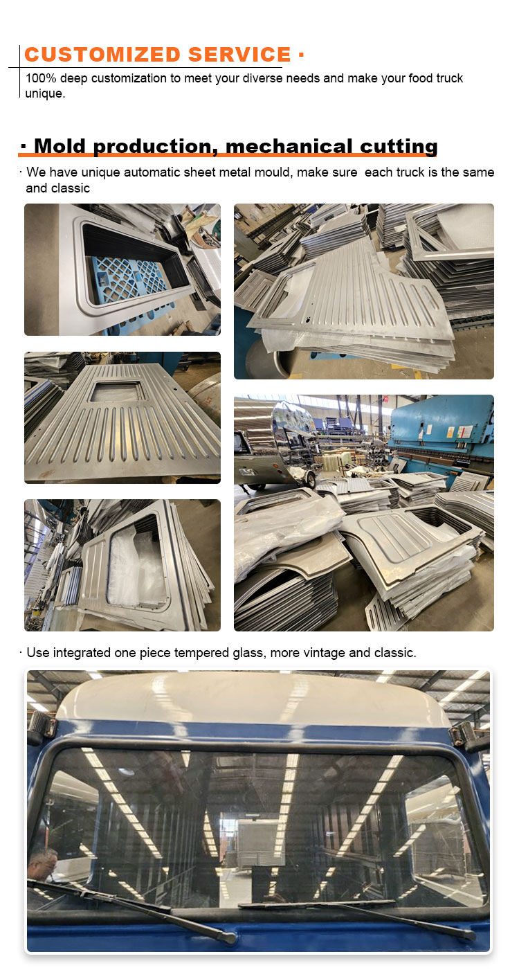 모델링 및 스타일: 푸드트럭의 외관 모델링 및 스타일은 고객을 유치하는 중요한 요소입니다. 유선형 디자인, 복고풍 스타일, 현대적인 단순성 등 고객의 브랜드 이미지, 비즈니스 특성 또는 개인 취향에 따라 맞춤 설정할 수 있습니다.