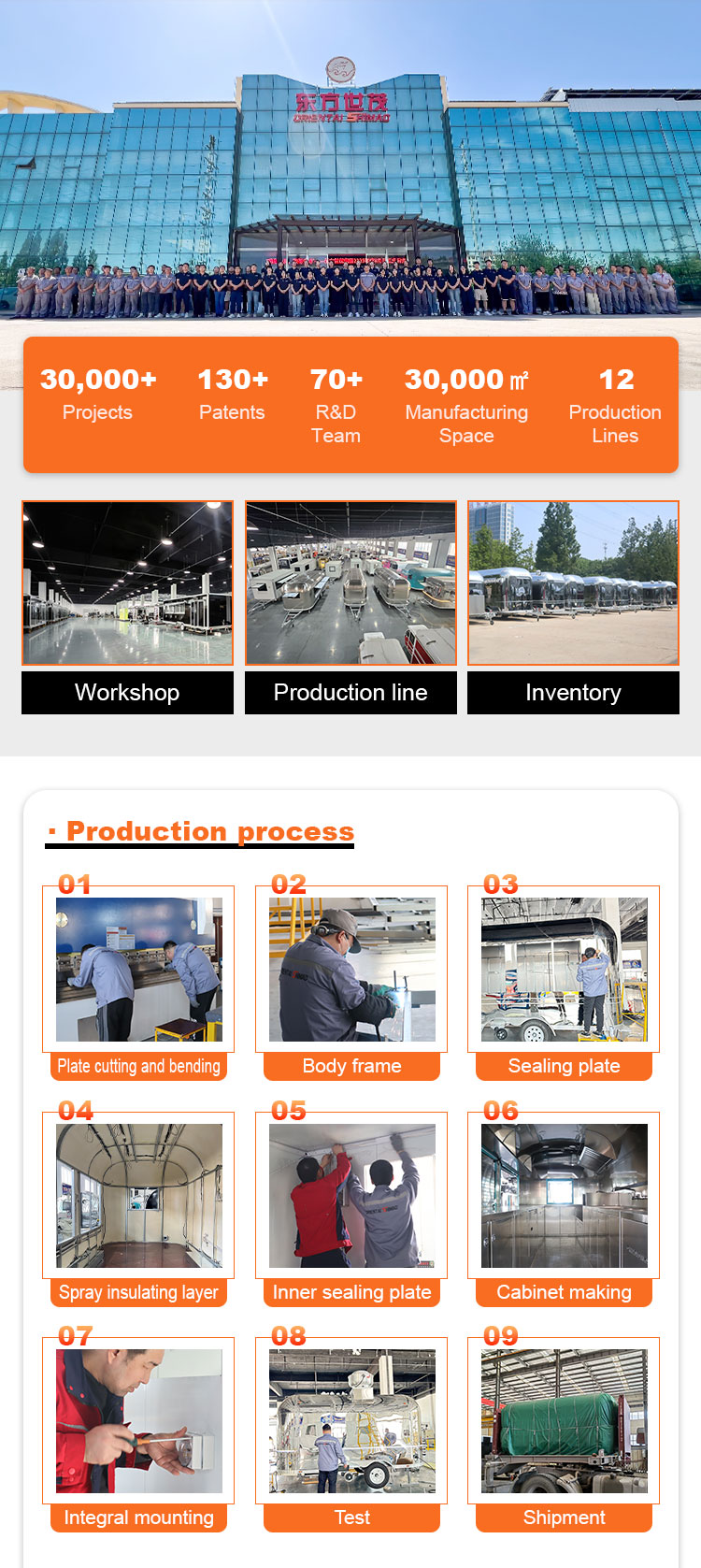 차체: 설계 계획에 따라 차체를 절단, 용접, 광택 처리 및 기타 공정을 통해 차체 구조가 안정적이고 아름답도록 보장합니다.